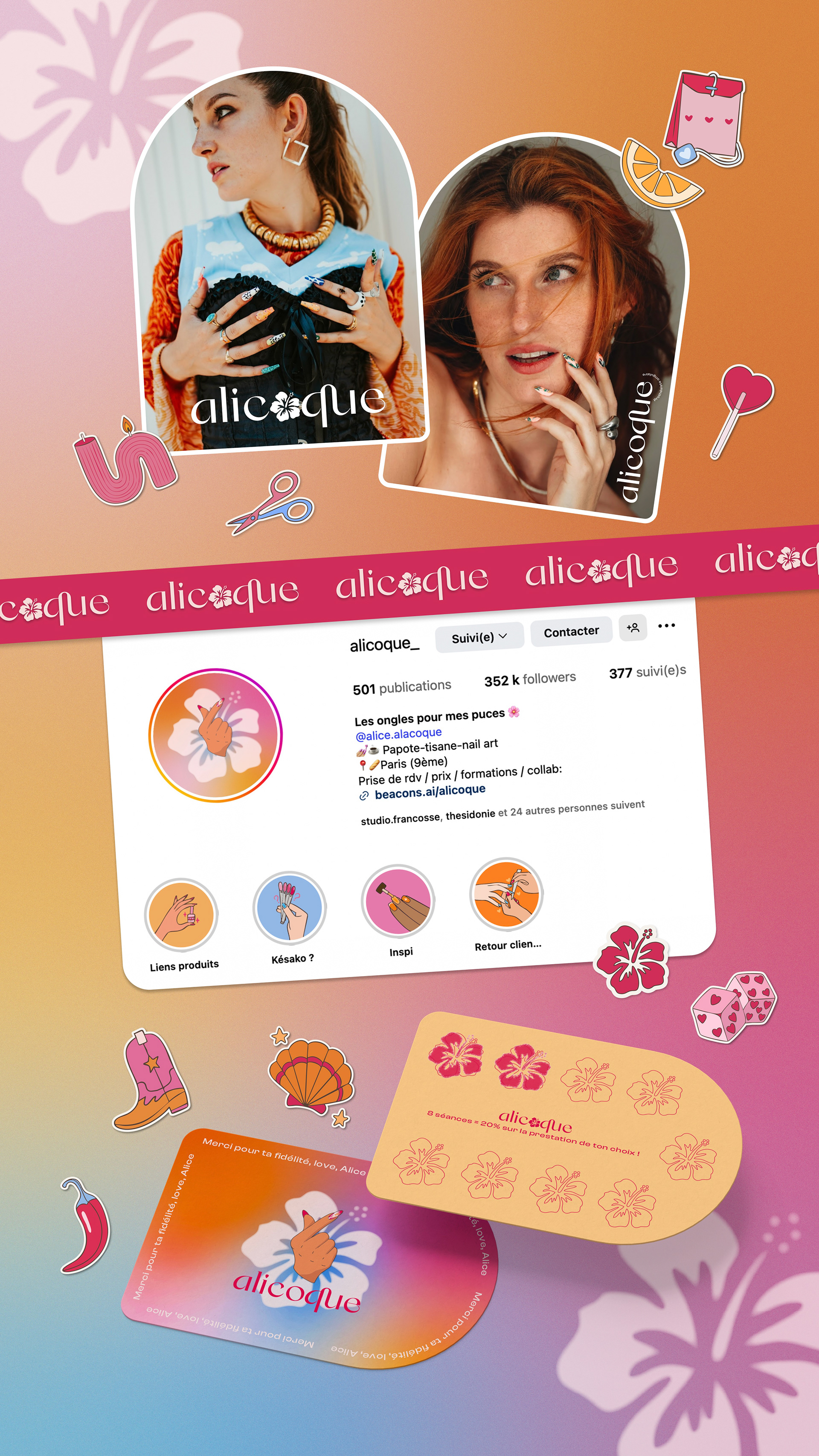 Alice, fondatrice et prothésiste ongulaire d’Alicoque, a lancé un appel à projet pour trouver sa future graphiste.Parmi plus de 400 candidatures, j’ai eu la chance d’être sélectionnée dans le top 30. Je n’ai pas remporté le projet, mais je reste très fière de ma proposition et du travail créatif réalisé.